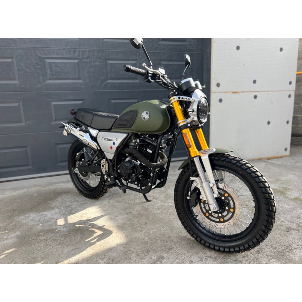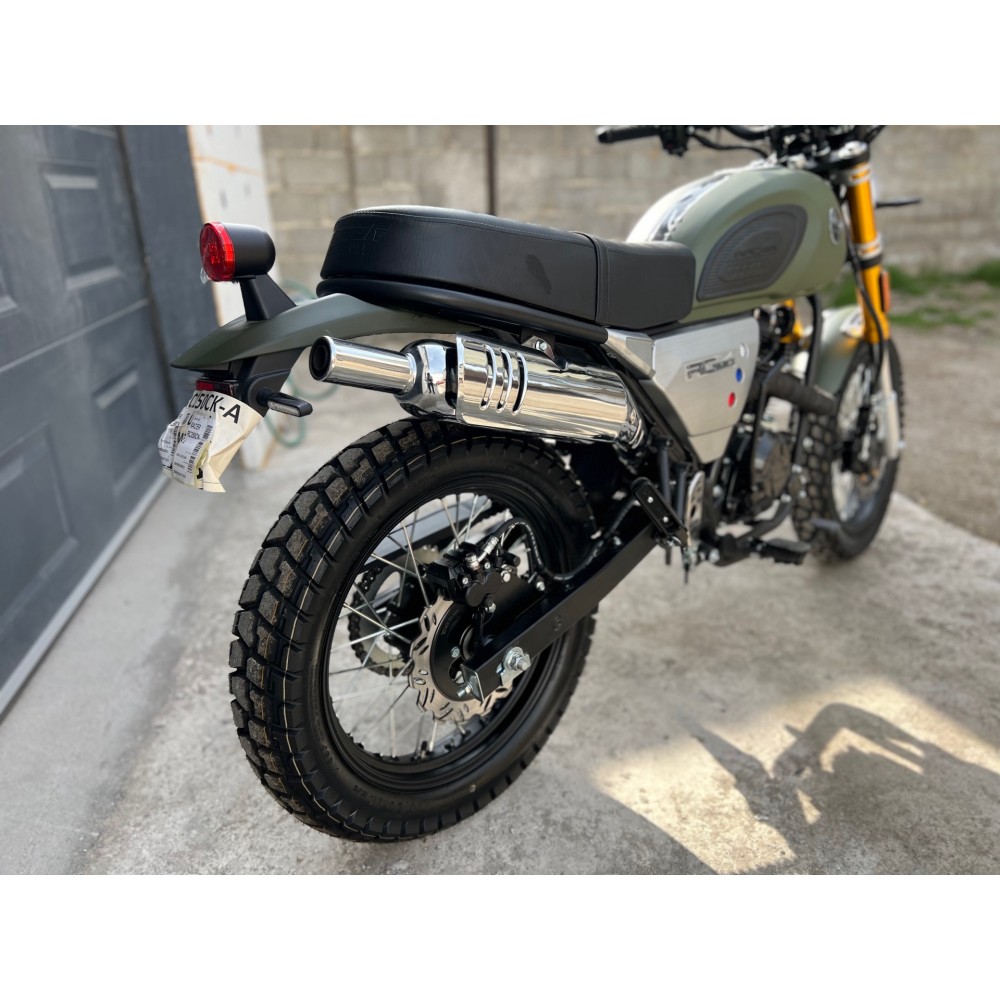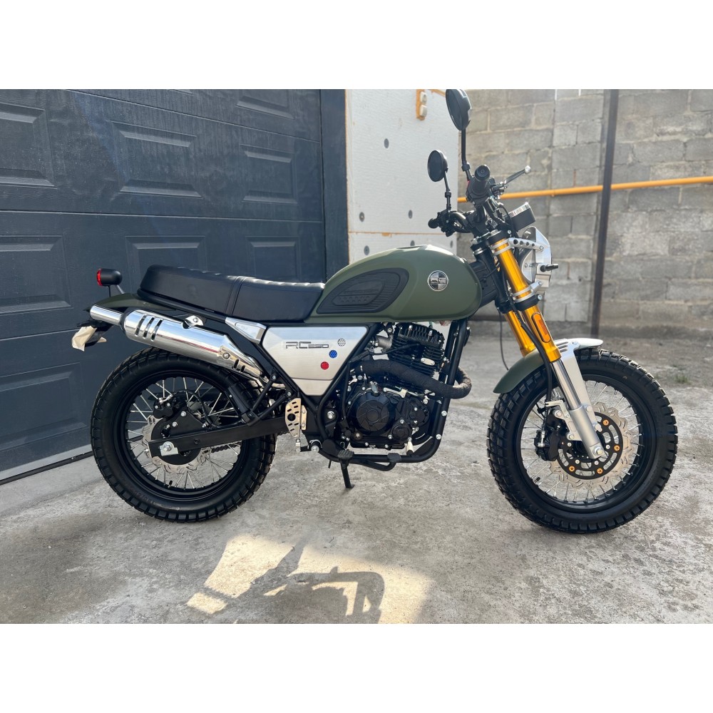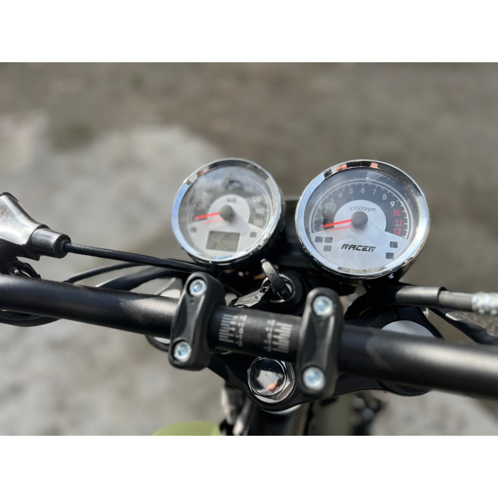 RACER RC300-GY8H TRIUMPH - универсальный мотоцикл в стиле скремблер. Новейший двигатель 175FMN, с воздушно-масляным охлаждением, объемом 300см3 и мощностью 24л.с, с балансировочным валом, для большего комфорта. Обладает уверенной тягой во всем диапазоне оборотов, а также приятным звуком, что немаловажно, для подобных мотоциклов. Стильный британский дизайн. Футуристичная LED фара. Универсальные покрышки грунт-асфальт и высокая выхлопная труба делают этот мотоцикл предназначенным не только для асфальта и городских пространств, но и для грунта и легкого бездорожья.