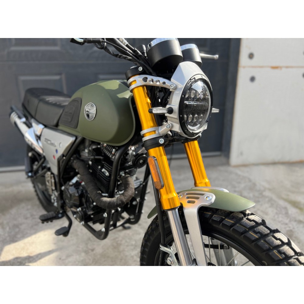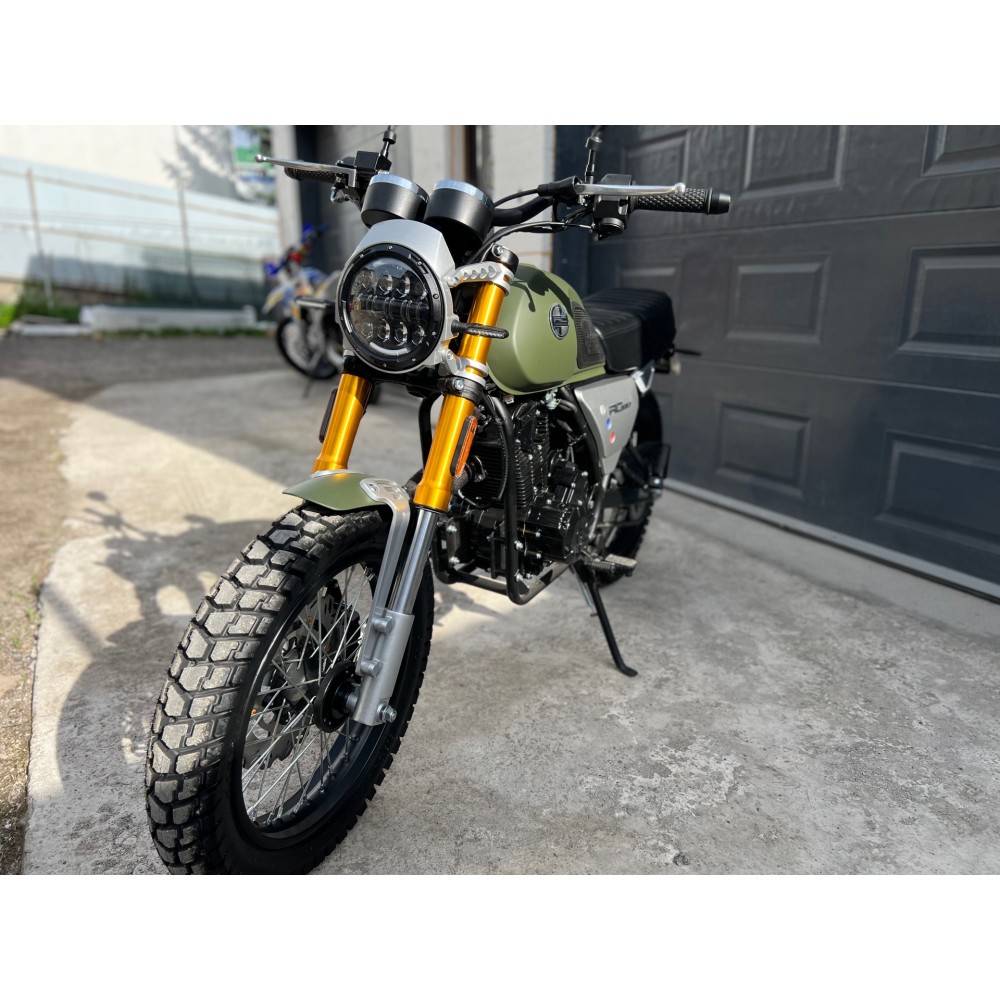 Мотоцикл собран из качественных комплектующих, например крылья и бак сделаны из металла, а не пластика. Усиленный алюминиевый руль переменного сечения 28мм на сайлентблоках.
