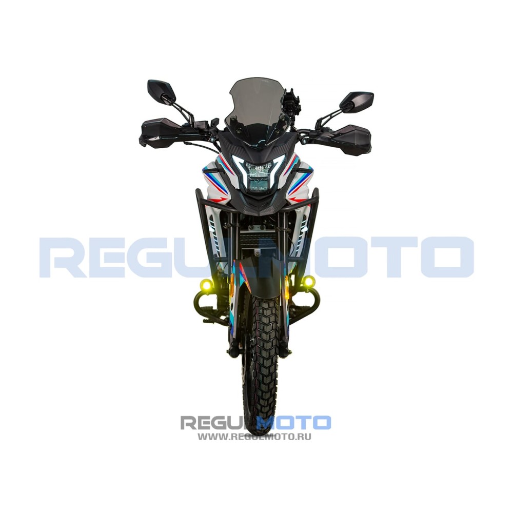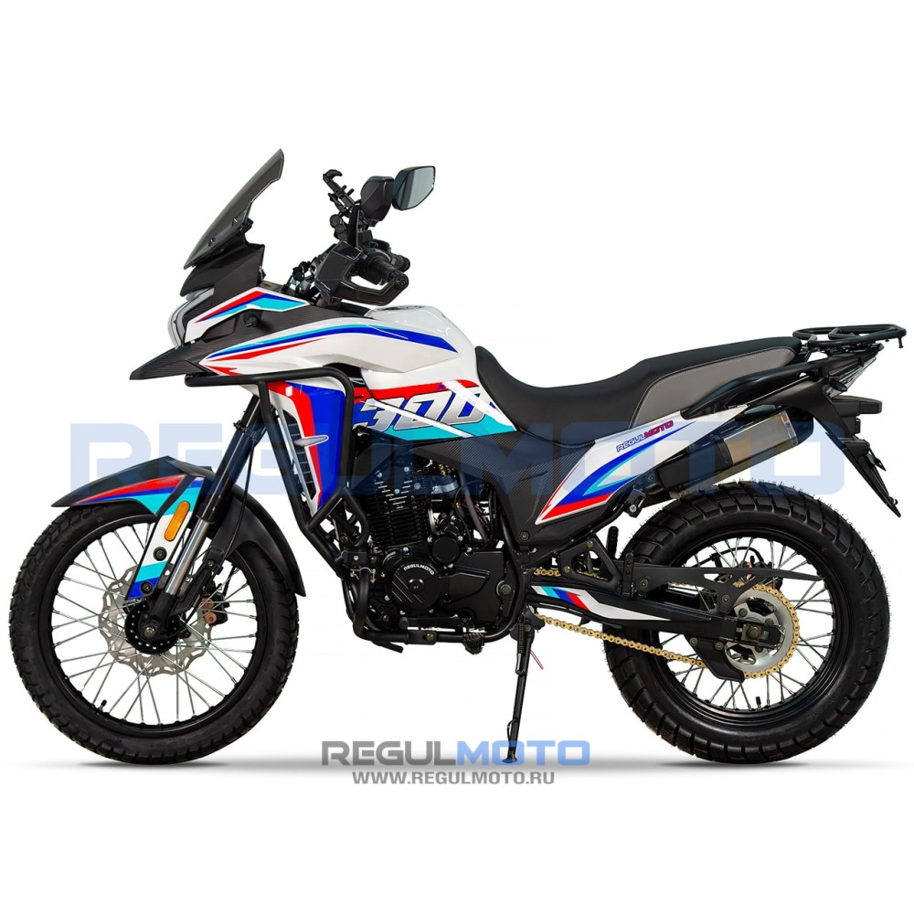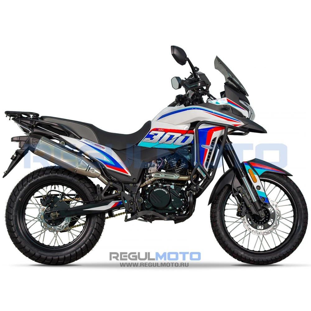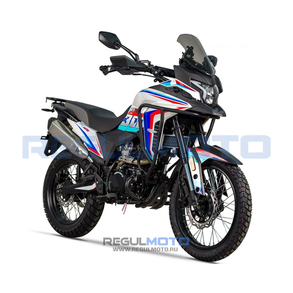 Regulmoto XADV — это универсальный туристический эндуро, созданный для приключений как по городу, так и за его пределами, на асфальте и лёгком бездорожье. Он оснащён 300-кубовым двигателем на \(28\) л.с., который имеет балансировочный вал и воздушно-масляное охлаждение, а также спортивный карбюратор NIBBI PWK34 для лучшего отклика на газ. Мотоцикл имеет комфортную подвеску, спицованные колёса диаметром \(19^{\prime \prime }\) спереди и \(17^{\prime \prime }\) сзади, и множество полезных опций в комплекте, таких как защита рук и двигателя, а также держатель для телефона с USB-портом.