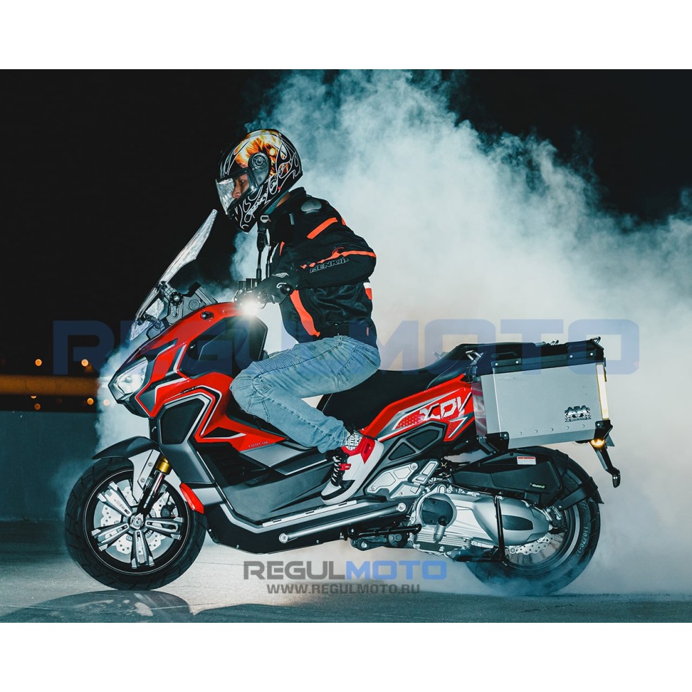 Regulmoto XDV PRO 300CC (кроссовер в мире скутеров) с одноцилиндровым четырехтактным четырехклапанным двигателем с жидкостным охлаждением и впрыском объемом 278,2 куб.см. (полученный в результате сотрудничества Piaggio Group с Zongshen), поршень 75мм, ход 63мм, степень сжатия 11, мощность 25 л.с. / 7500 об / мин, крутящий момент и 24,5 Hm при 6750 об. / мин.