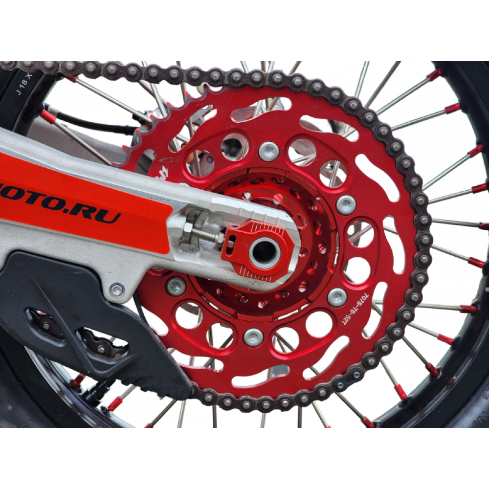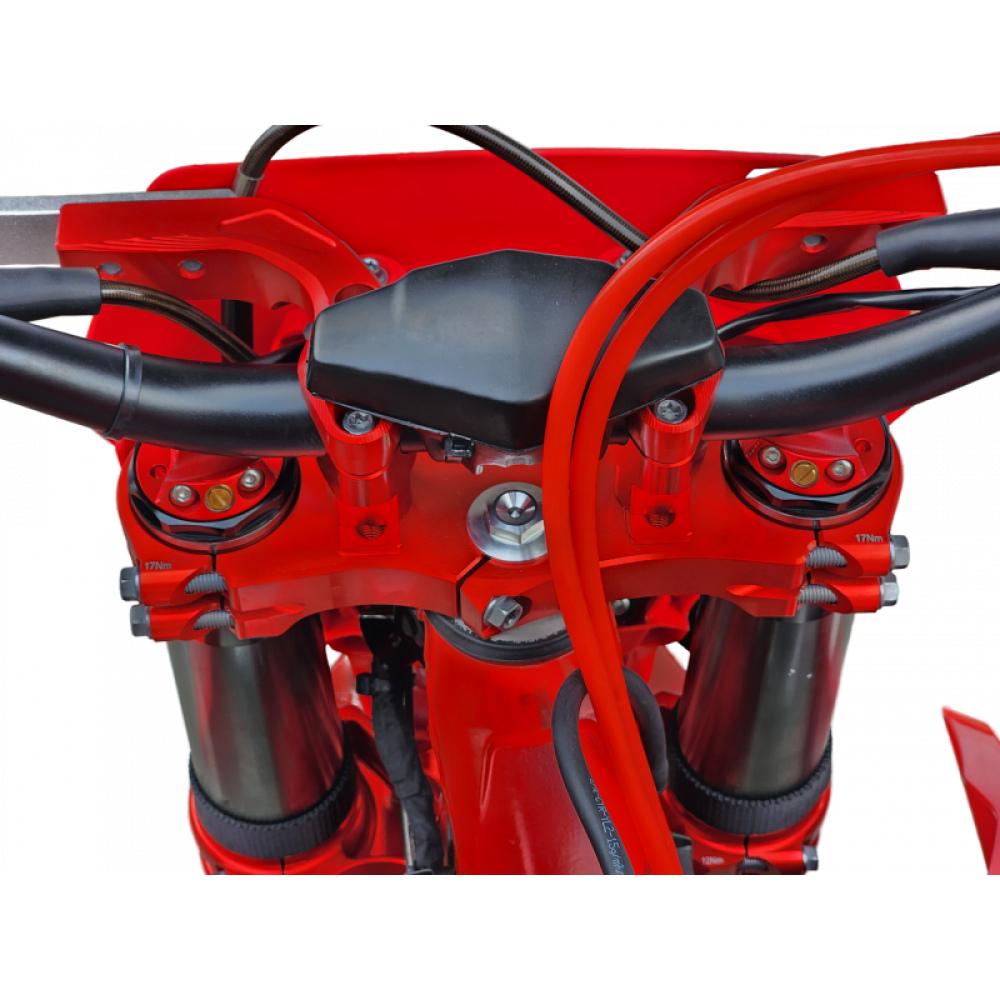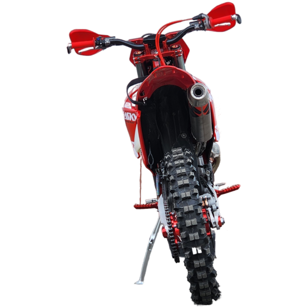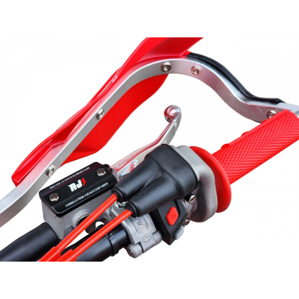 Тормозная система AJ1 (аналог Brembo) в сочетании с алюминиевыми ободами KKE, фрезерованными ступицами и подшипниками NSK обеспечивает непревзойденную безопасность. Комплектация включает усиленный руль из сплава 7075, пульты KTM, антискользящее сиденье AJ1, пеги и лапку КПП в стиле KTM.