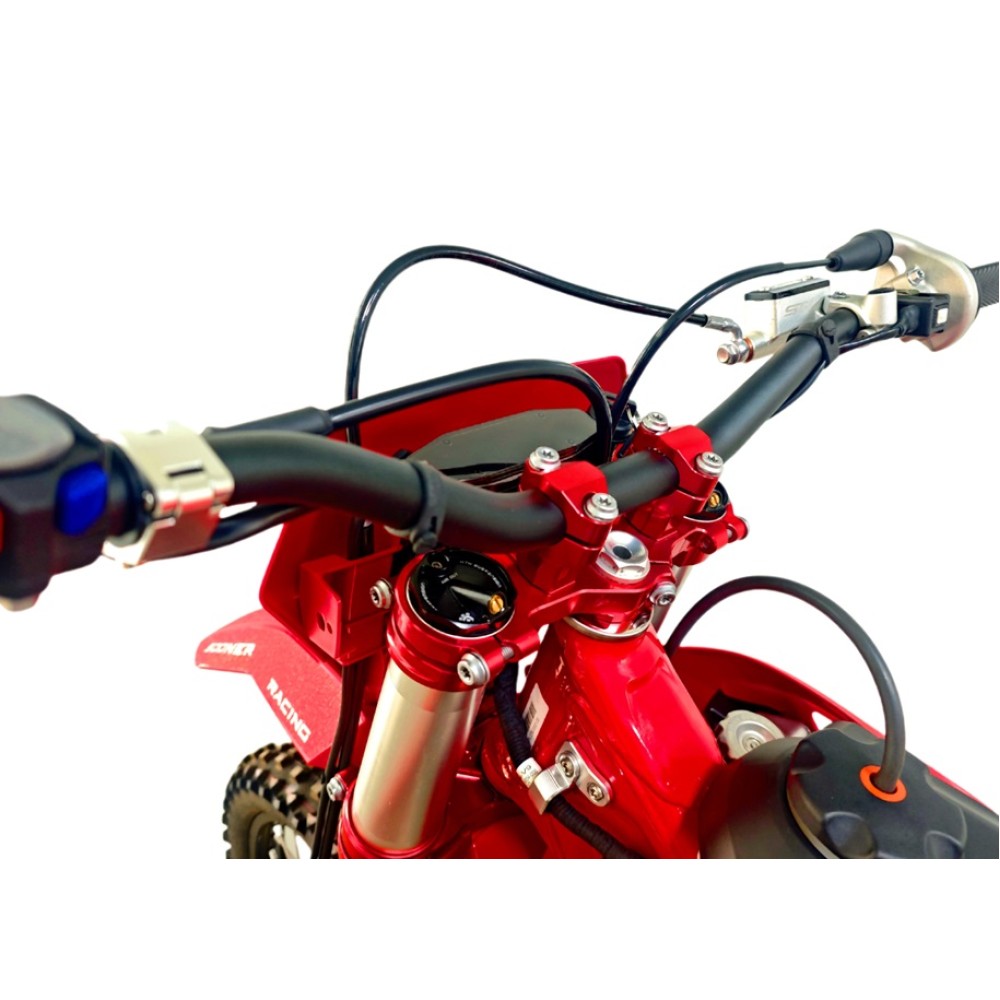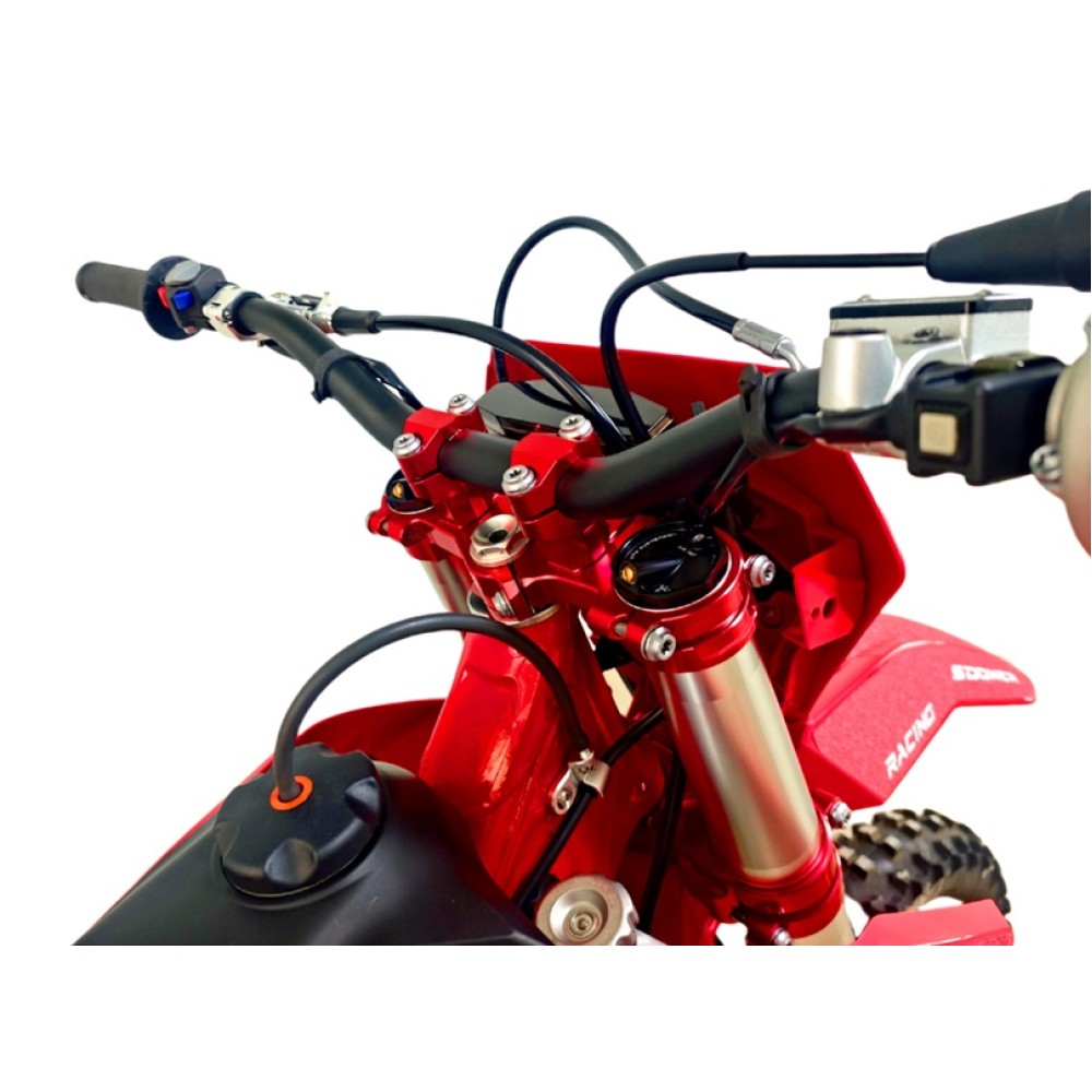Мощные фрезерованные траверсы, анодированные в красный цвет, обеспечивают жесткую фиксацию передней вилки и исключают люфты при жестких приземлениях.